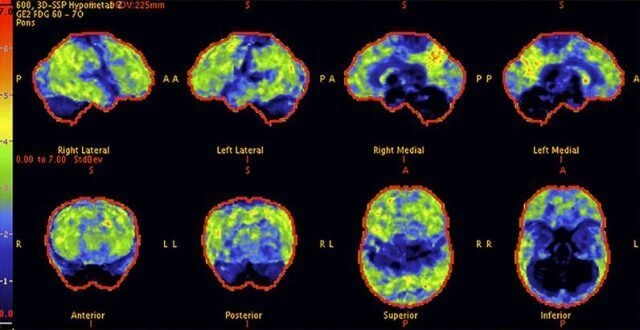 Above: The patient's PET scan after CureFight treatment shows improvement, with cognitive abilities greatly enhanced as the scan approaches that of a normal brain.